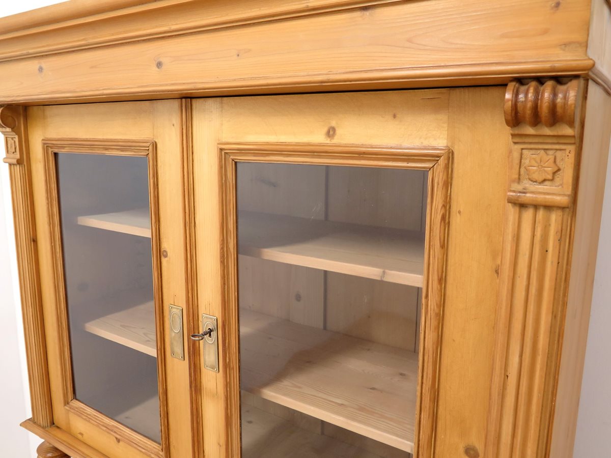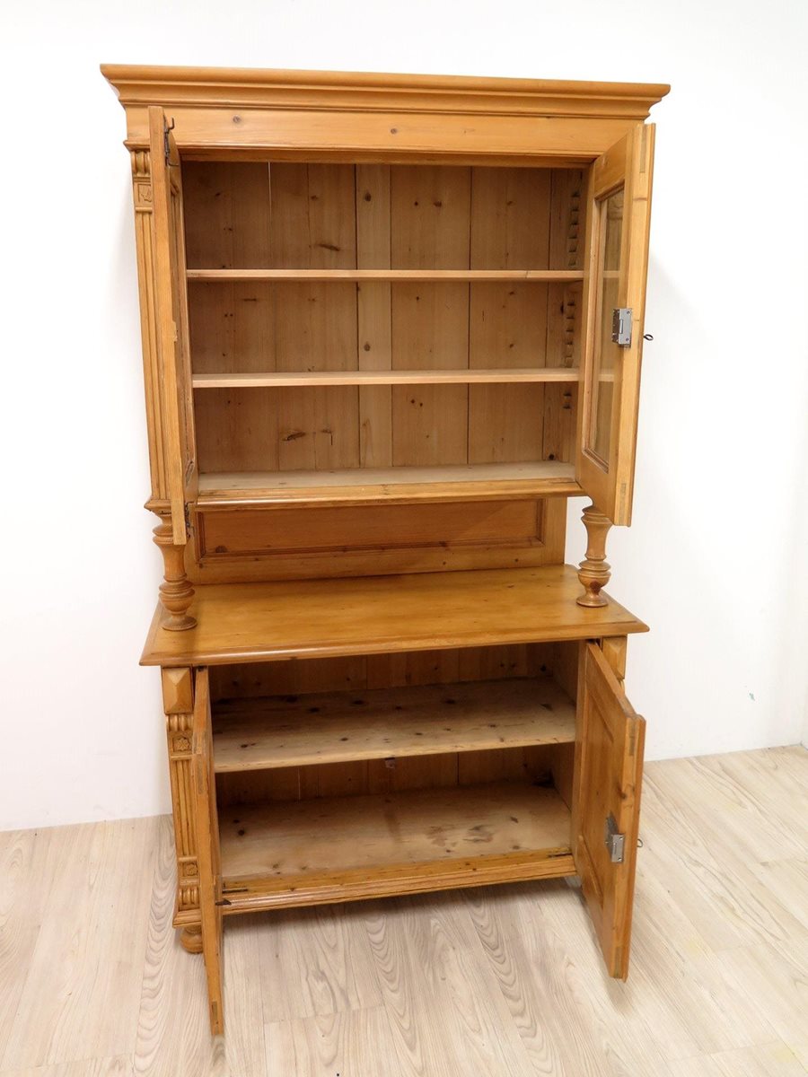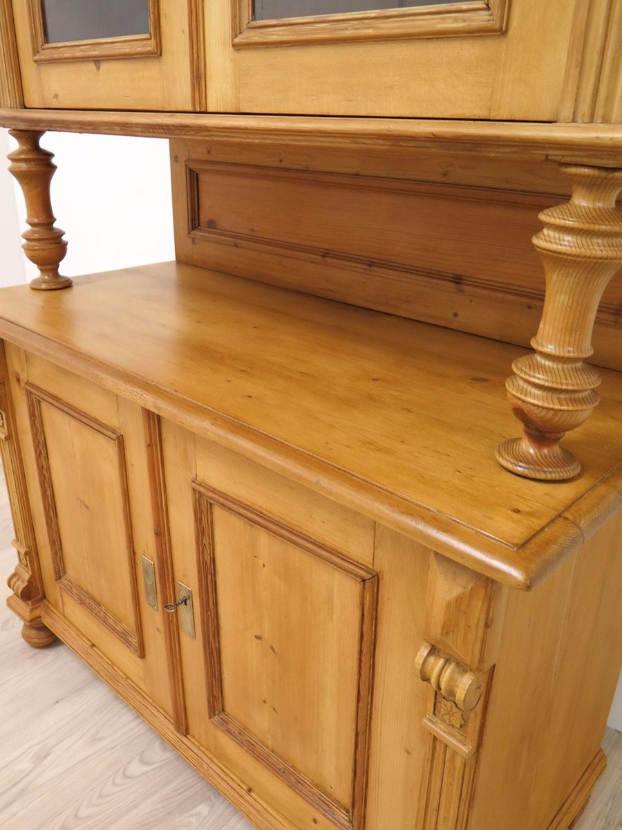 Stylová starožitná kredenc ze smrkového masivu po odborné renovaci. Nádherný kousek ve velmi zachovalém stavu. Stabilní a pevná konstrukce (2 díly).
