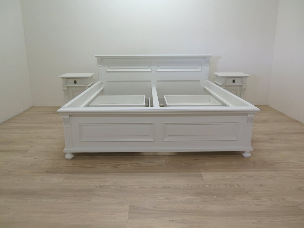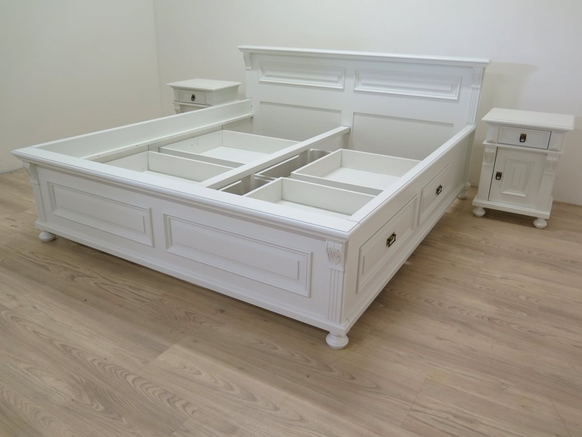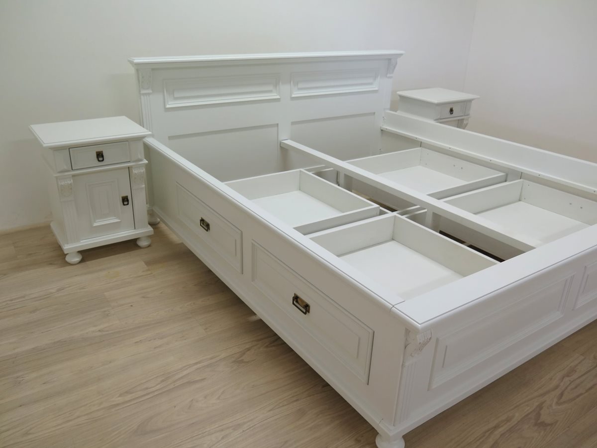 Postel a noční stolky ze smrkového masivu z kolekce Deluxe.