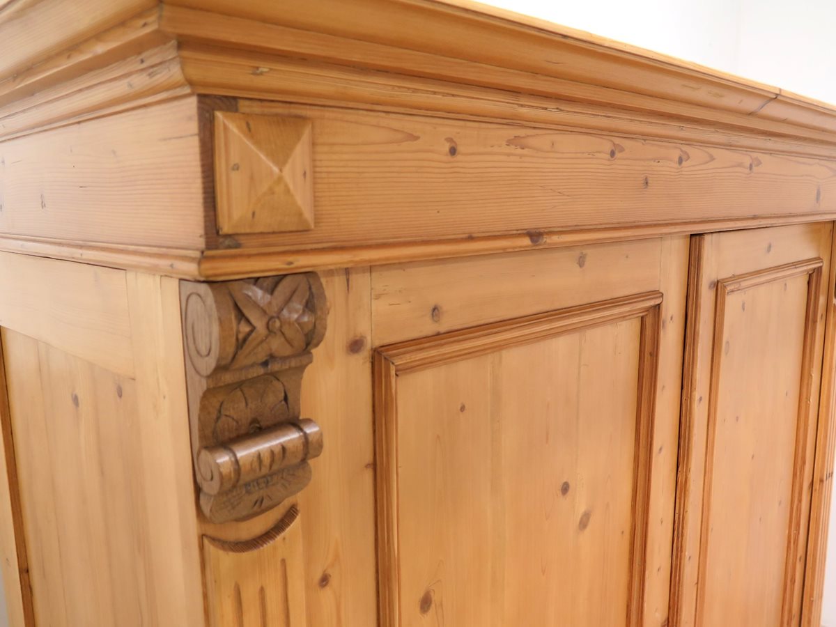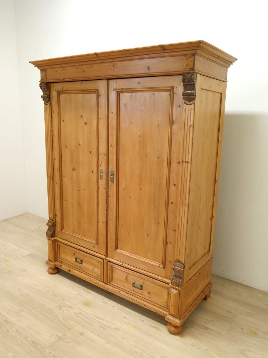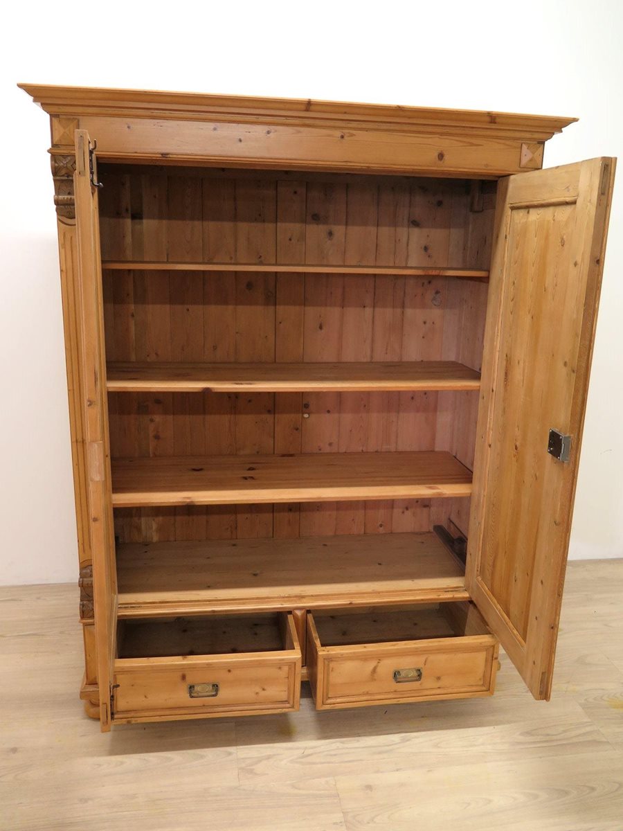 Zdobená starožitná šatní skříň ze smrkového masivu po odborné renovaci. Nádherný kousek ve velmi zachovalém stavu. Stabilní a pevná konstrukce. Skříň je rozebíratelná.