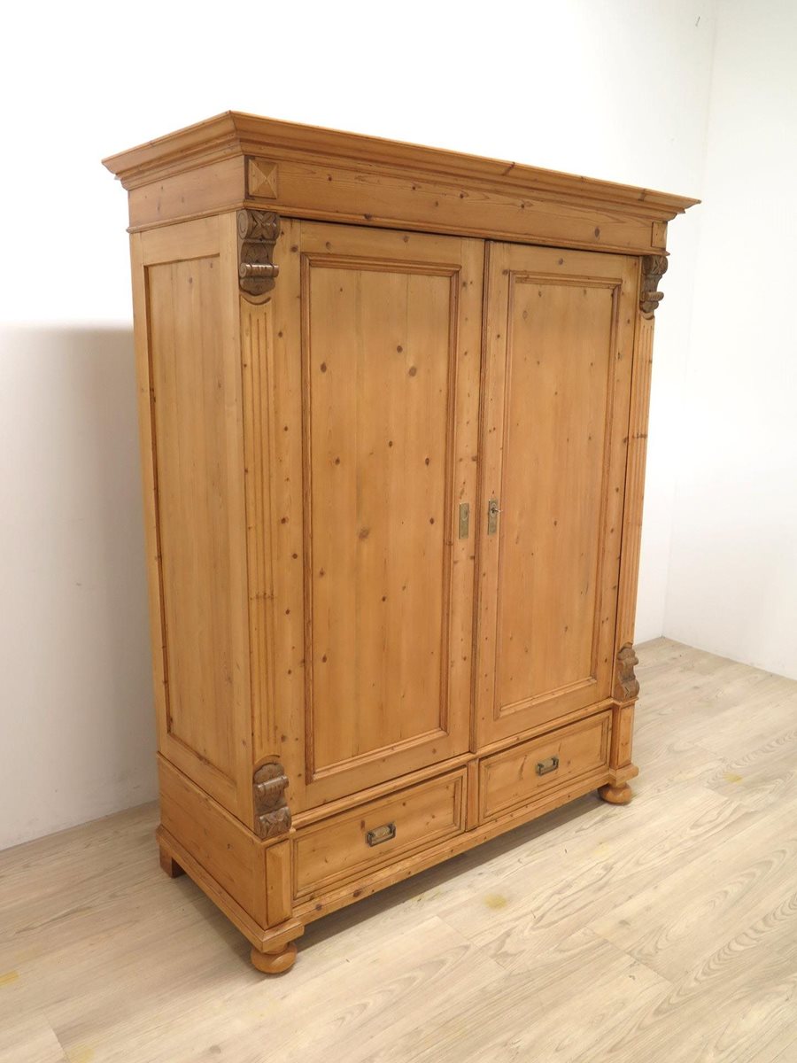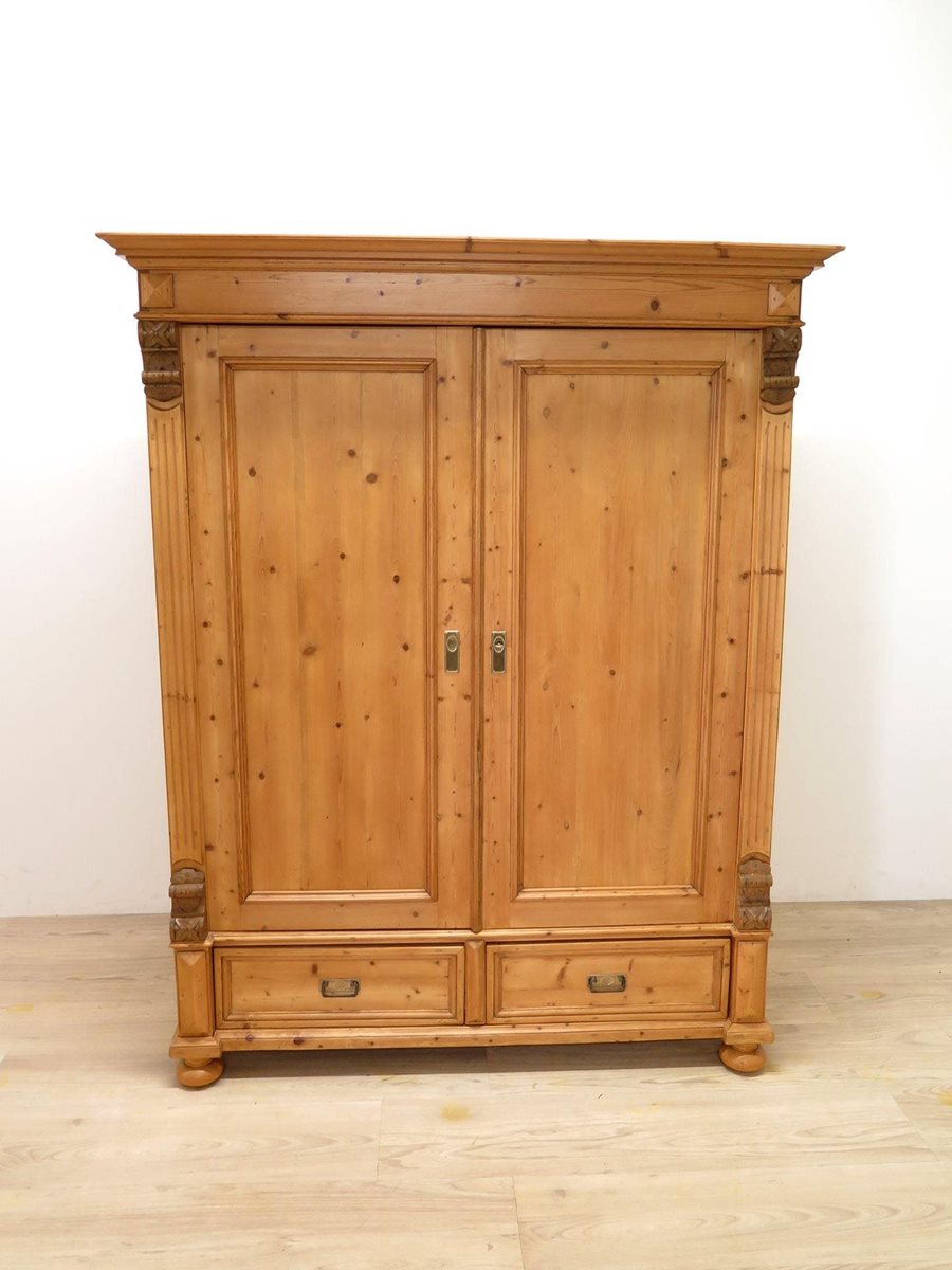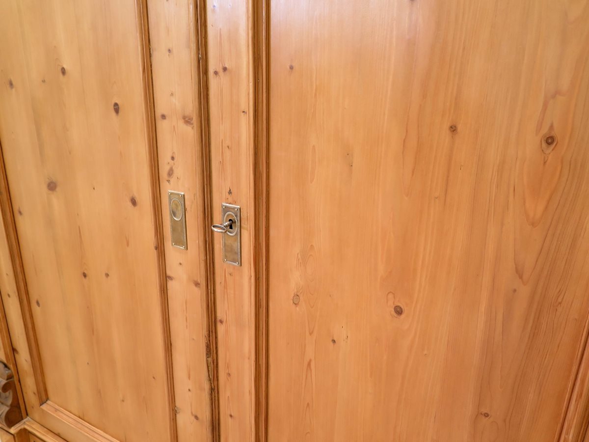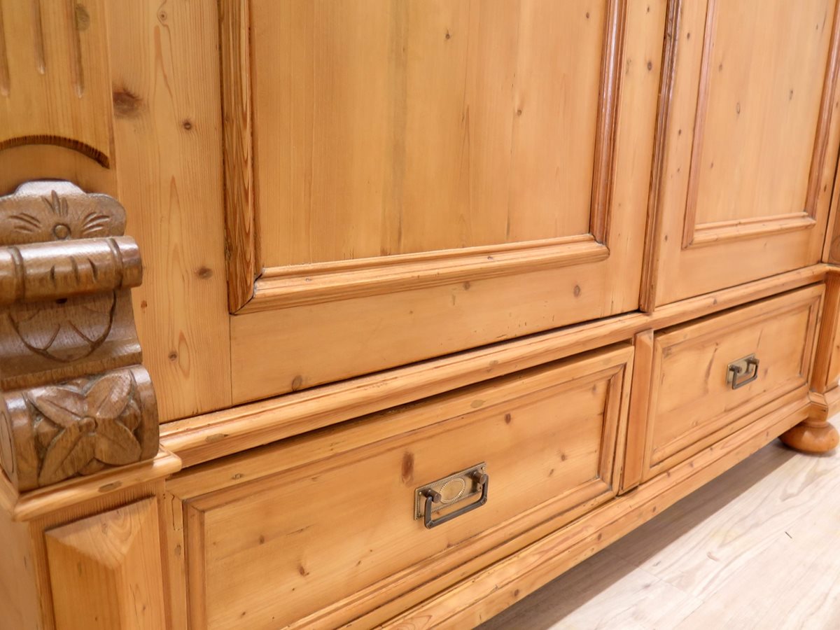 Zdobená starožitná šatní skříň ze smrkového masivu po odborné renovaci. Nádherný kousek ve velmi zachovalém stavu. Stabilní a pevná konstrukce. Skříň je rozebíratelná.