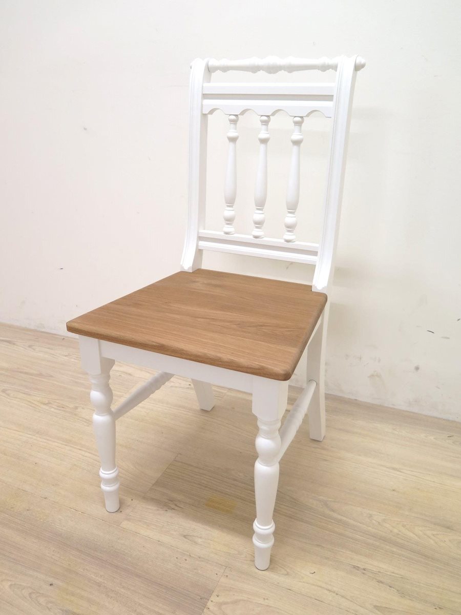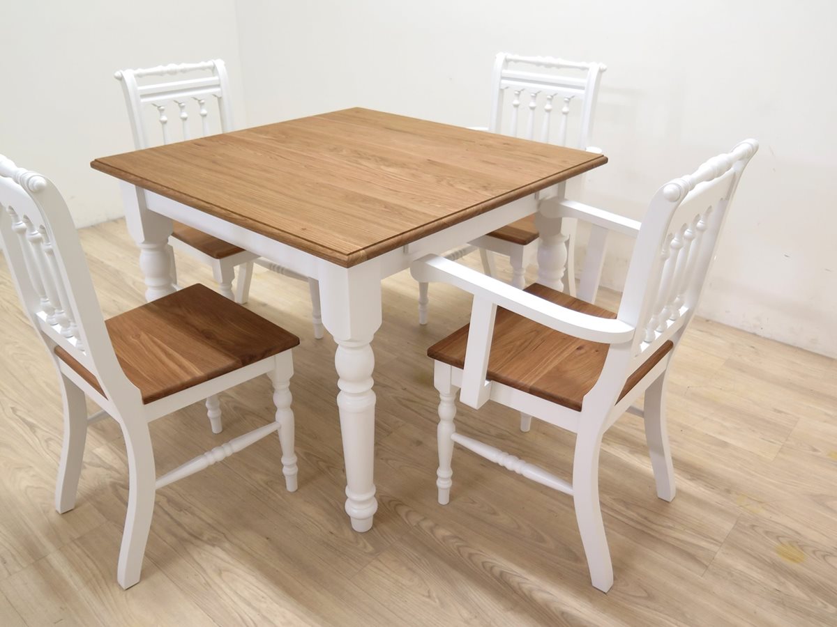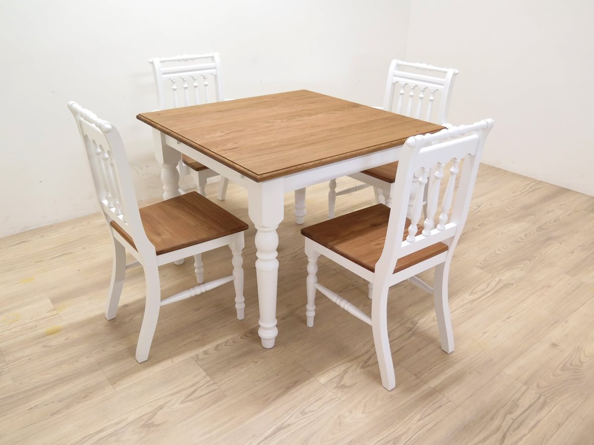 Jídelní sestava ze smrkového masivu s dubovou deskou a dubovými sedáky.