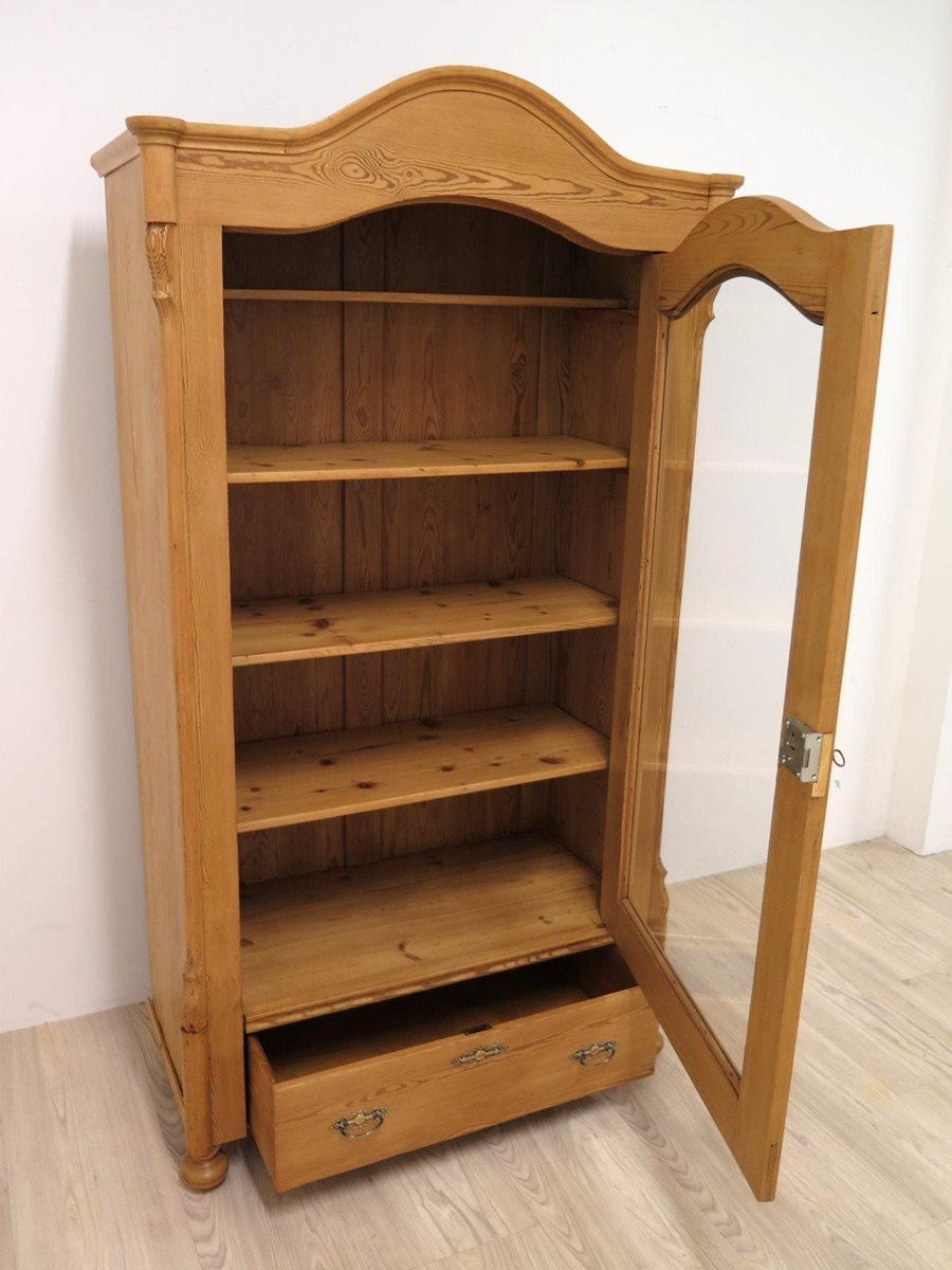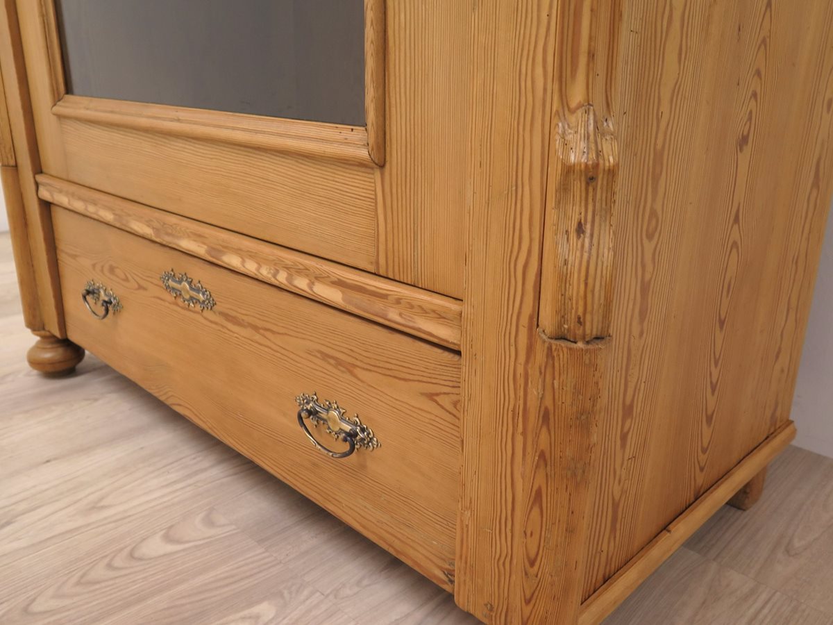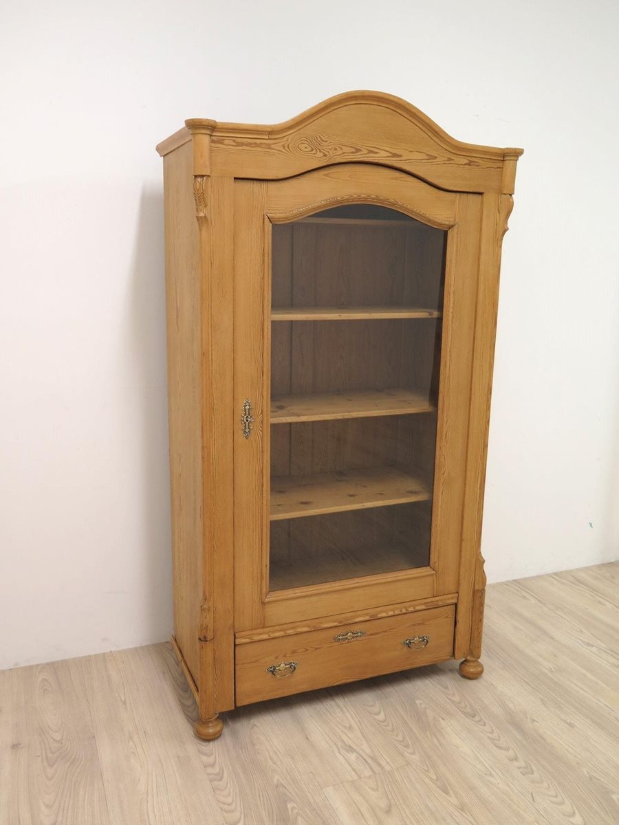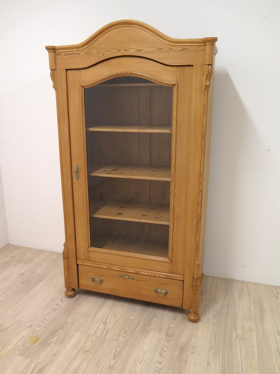 Hezká vitrína s obloukem ze smrkového masivu po odborné renovaci. Nádherný kousek ve velmi zachovalém stavu.